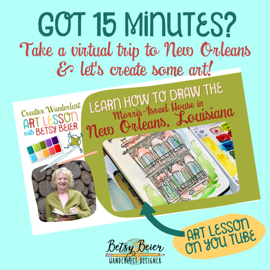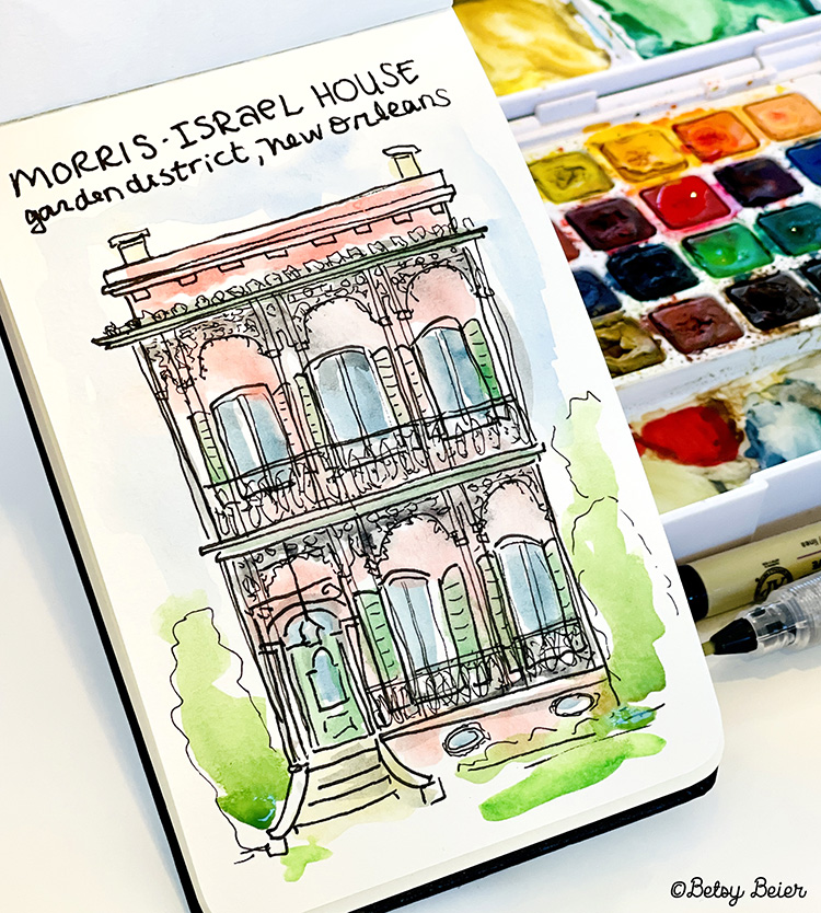 Follow along with this ~15 minute lesson and learn how to draw a New Orleans Garden District house, the Morris-Israel Home. We will virtually travel to NOLA where I will tell you a little about the house. Then, I will teach you a doodle approach to drawing the iron work sometimes called “iron lace” to give the impression of intricacy yet with a loose impressionistic approach.