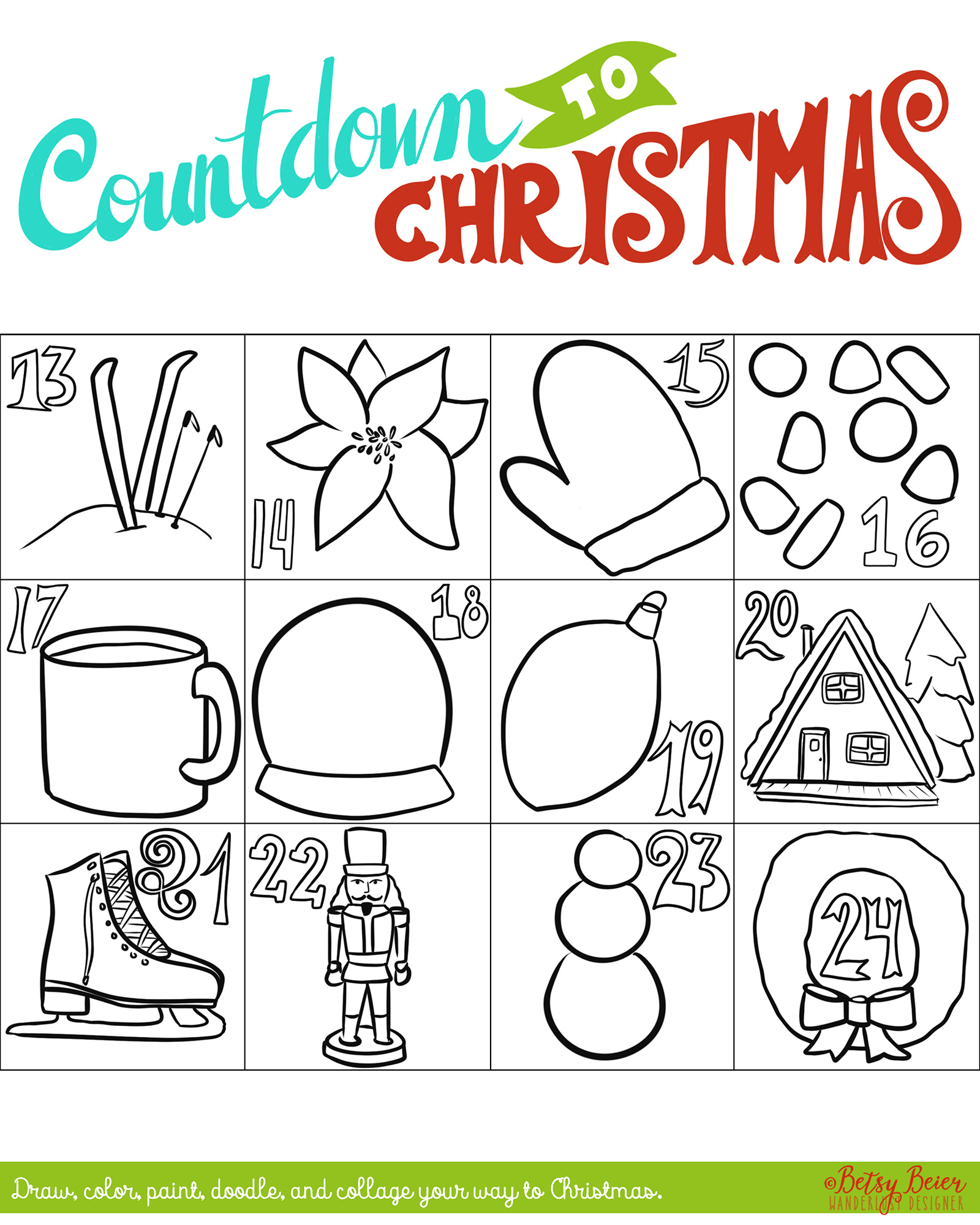 This countdown is all about playing with art. I’ve created simple holiday icons for each day and it’s our job to decorate each day however we like — watercolor, crayons, color pencil, markers, glitter, collage, paint, doodle — whatever medium, however you’d like! This project is all about being creative and exploring. There’s not need to worry about staying in the lines, just create and have fun.