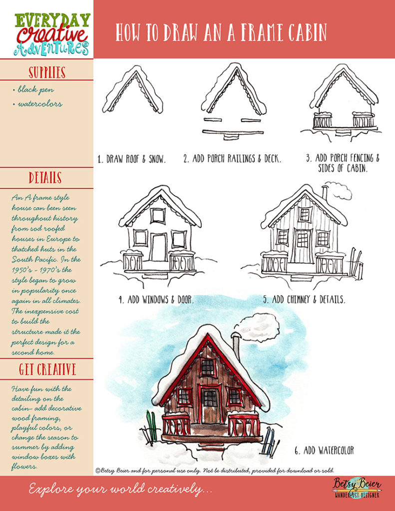 I love the coziness of an A frame cabin in the woods! I can’t think of a better place to be snowed in than a small A frame with a small living room, kitchen and bath on the bottom floor and a loft bedroom up a ladder. With plenty of food and fire wood, I would enjoy spending hours reading and sketching with a nap somewhere in between! Here’s a simple drawing tutorial to create your own A frame cabin in the winter.
