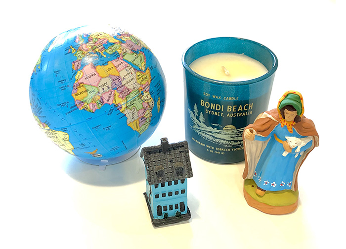 For this project, I picked my favorite turquoise blue shade and found: a small globe, a mini-house souvenir from Denmark, a candle and a santon figurine from Provence. They are an odd pairing of objects, yet still make for an interesting illustration. Below is the still life on my desk.