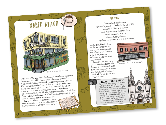Wanderlust San Francisco takes you to 13 different neighborhoods and offers historical details and fun facts that give insight into the vibe of the neighborhood today. Each chapters also highlight landmarks and unique sights to see the area with a creative lens.