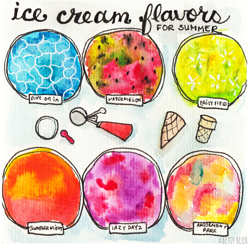So pull out your creative journal and follow along with this video tutorial below to create 6 ice cream flavors for the season in your journal. Feel free to pause the video at any time to read the brief instructions or catch up on drawing. This prompt is all about exploring colors of the season and letting watercolor “do its thing” even if it gets messy! Also, try to come up with flavors that aren’t necessarily food related, but seasonal. You may come up with a new all time hit!