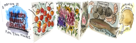 Finally with provided materials, we dive into a hands-on activity where we are inspired by our location. We use all our senses and get immersed in our adventure by exploring the details of our selves and surroundings through art, writing, and photography. Above shows a sample folded journal of writing and sketches from exploring a local farmers market.