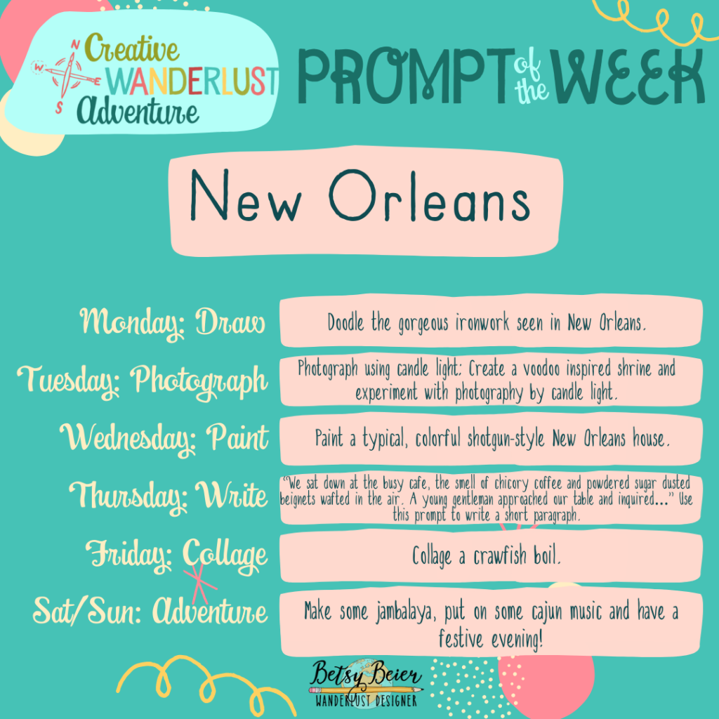 So put on some Cajun tunes, or Preservation Hall jazz and lets head to the Big Easy this week for our creative wanderlust prompts. Laissez les bon temps rouler (let the good times roll)!!!