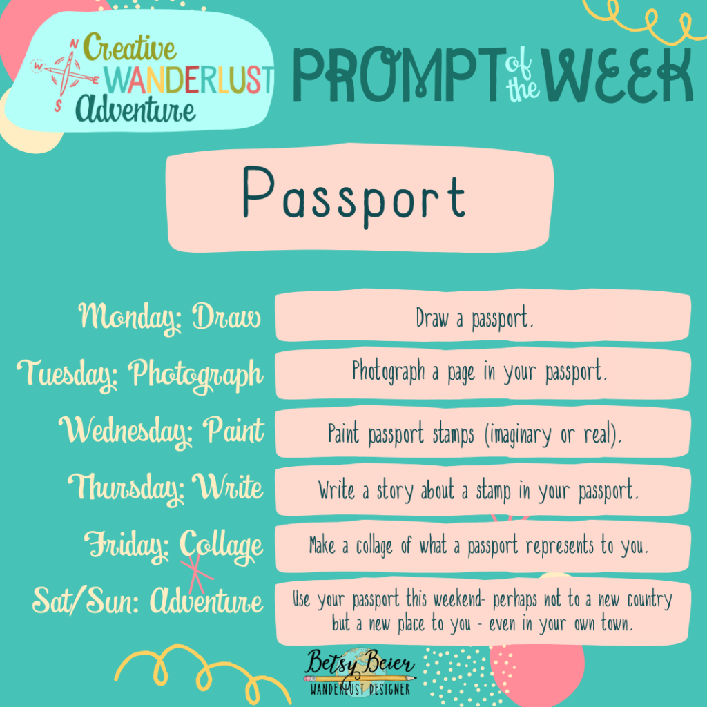 I’m excited to think creatively about my passport this week and have fun with these artistic prompts. Some prompts I may be literal, but I expect many will be more imaginative and or about the feeling my passport provides me. I hope you join along and can’t wait to see what your passport means to you!