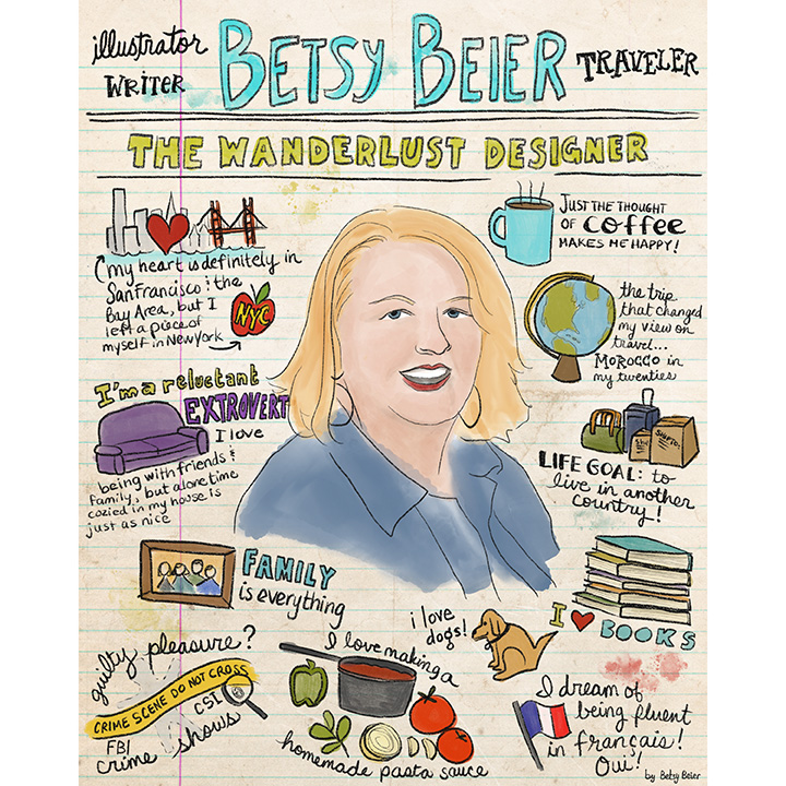 Over the years I have met so many amazing people in my daily adventures, whether it be at home, traveling or online. To celebrate these friends, and all that they do, I thought it would be fun to create an illustrated interview to provide a snapshot of who they are. To kick off the project, I created this illustration of myself with some little tidbits. Enjoy!