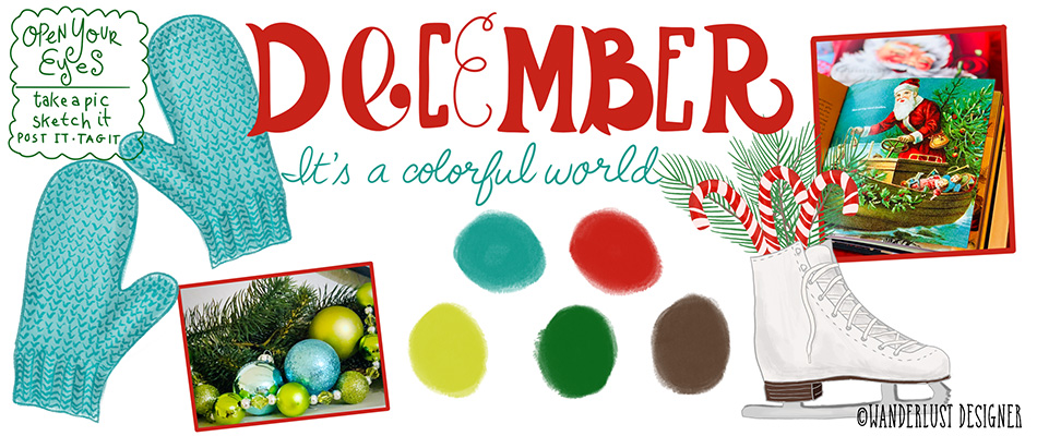 December is one of the best months to get out and about, open your eyes and see the colorful world we live in! Here’s a new palette for the month to keep an eye out for. These are some of my favorite holiday shades– cherry red, crisp turquoise, vibrant chartreuse, forest green and a rich brown.