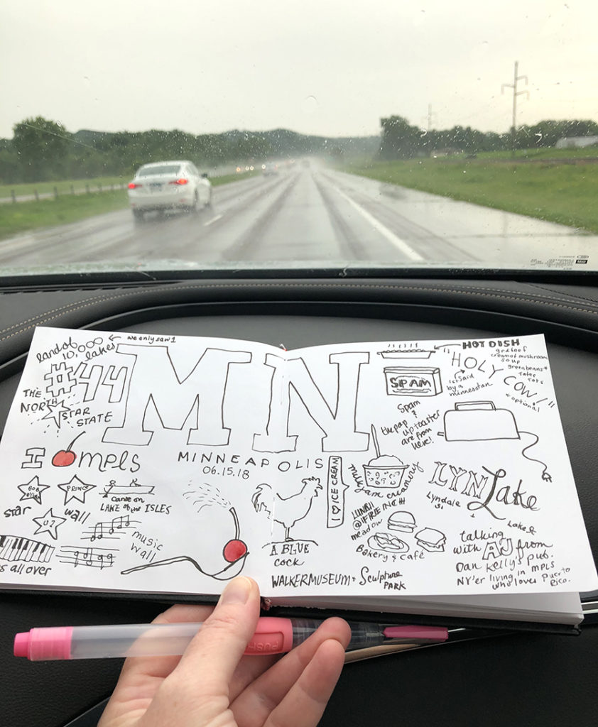 I’ve been keeping a travel journal of some sort for as long as I can remember. Some of my journals are purely a diary, a written account of what I did on the trip. Some are filled with simple doodles and some are even conversations between the people I traveled with. But by far, my most favorite travel journals are the ones with art in them. It may be a tiny postage sized stamp drawing, or a watercolor that fills the entire spread. I’ve made some with colored pencil and others with only a black pen. There are even a few that are collaged with found ephemera. Regardless of how well the art is rendered, or how eloquent the writing, they all give me a lot of joy to reread, and remember adventures of the past!