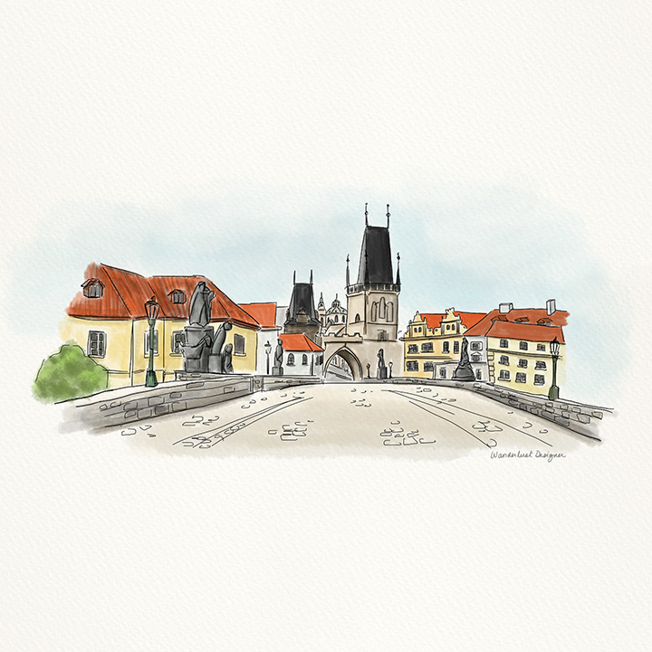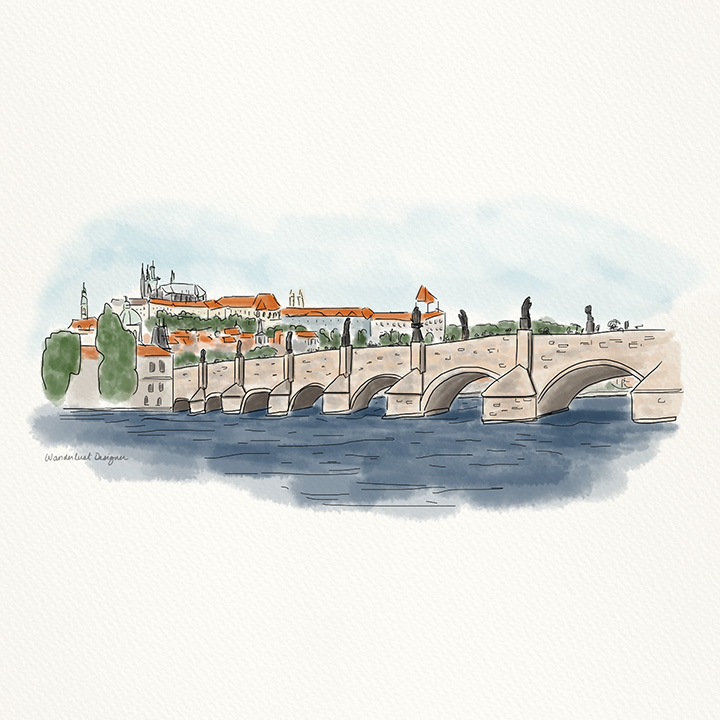 The Charles Bridge in Prague, Czech Republic is one of the top sites to visit. This historic bridge spans the Vltava river and connects Old Town Prague with Prague Castle. In the summer it is bustling with tourists exploring the city and soaking up the views. It’s the perfect spot to stop and capture in your travel journal. I used a simple layout for each image to help convey the beauty of the landmark. Here are a few of my journal pages.