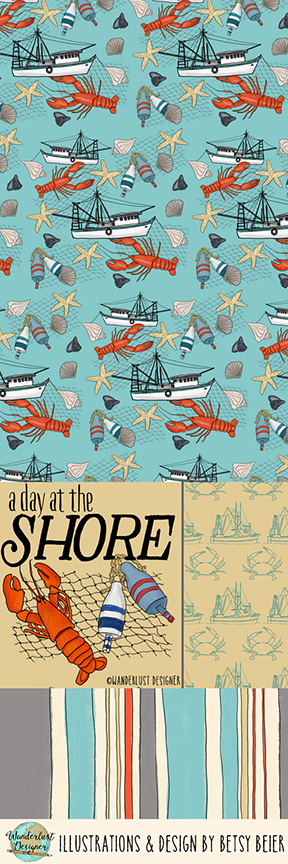 Summer is around the corner and what could be better way to spend the day than at the shore, or on the Cape for that matter! Here’s my latest summertime, seaside inspired pattern collection called “A Day at the Shore.” Lobsters in nets, colorful buoys, seashells, fishing boats and stripes come together for a collection that transport you to Cape Cod even for those who live in a desert.