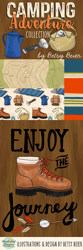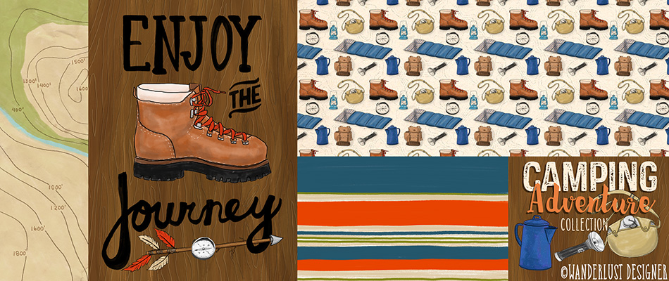 Summertime is made for camping! I’m lucky enough to have grown up and lived in some amazing areas in the West coast that offer incredible camping experiences. From sleeping under the tall redwoods of Northern California, to camping by a lake in the Sierras, there are just too many camping opportunities to list! To share my love for camping in the outdoors, I created this camping collection – a playful, hand drawn group of patterns and illustrations filled with iconography of the camping world, from wood textures to topo maps.